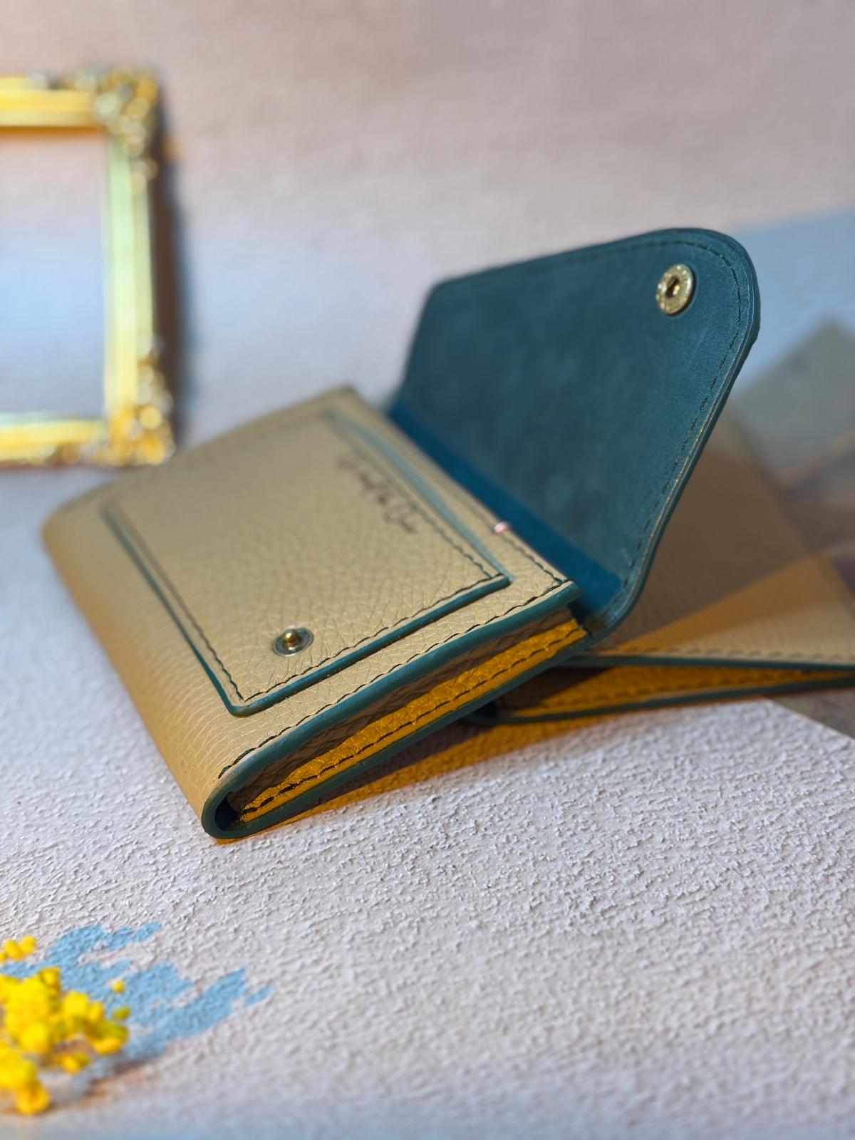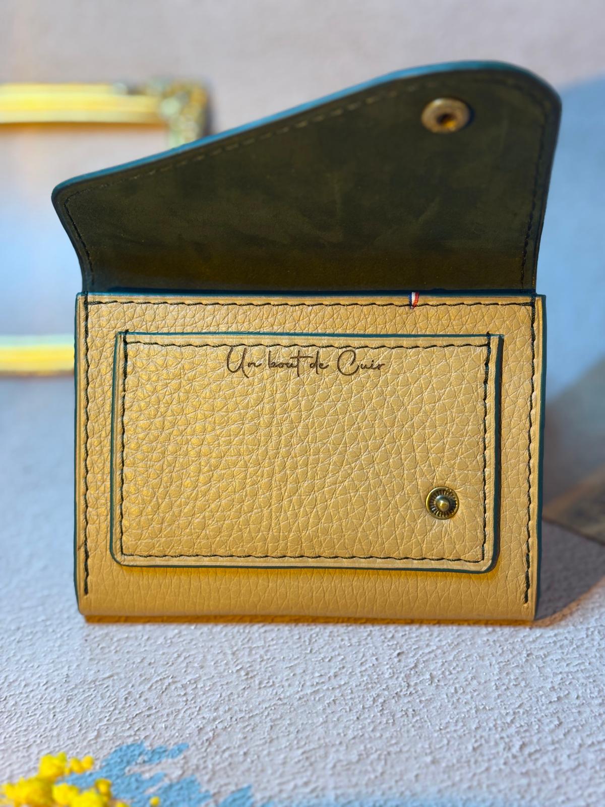 Le portemonnaie Déméter comporte un grand compartiment avec un petit soufflet de chaque côté pour y ranger billets et monnaies. Il se ferme grâce à un rabat maintenue par une pression, Une poche pour la carte bleue est prévu sur l’arrière pour qu’elle soit rapidement accessible.