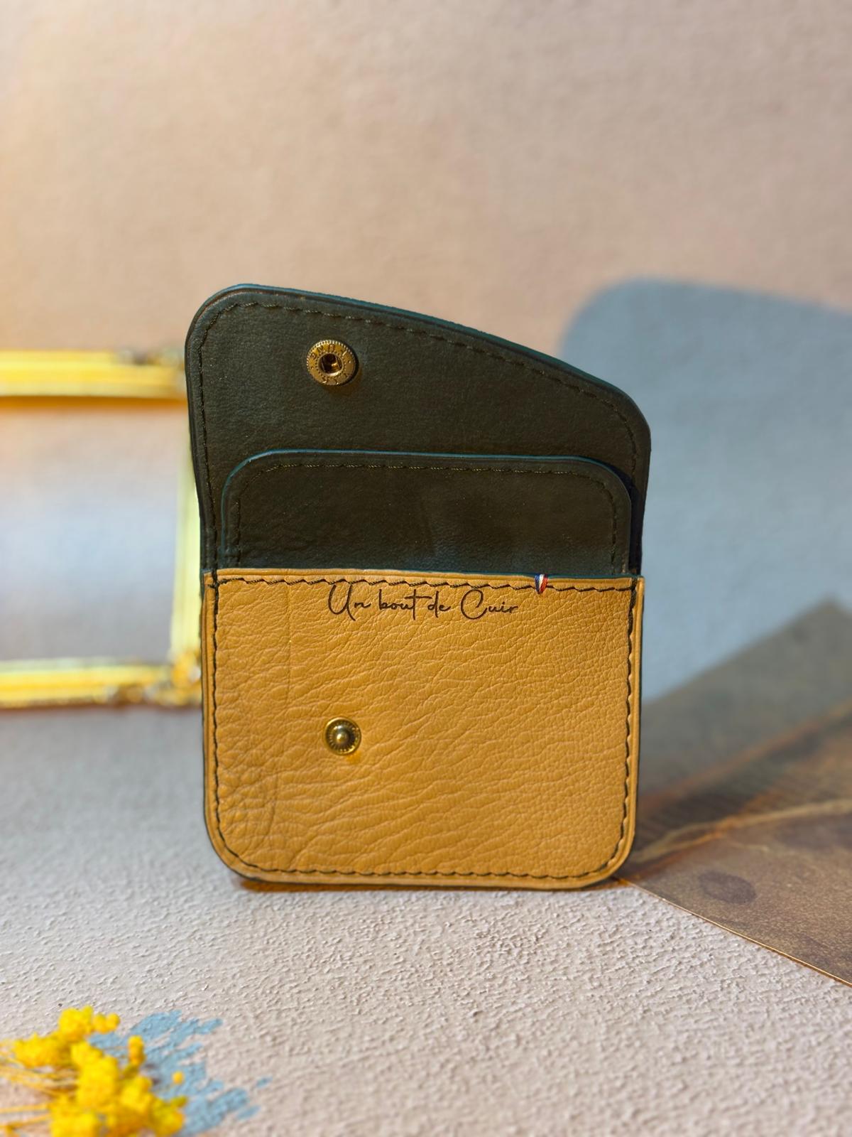 Ce modèle a été réalisé dans un cuir de vachette grainé marron clair, la doublure en vachette vert sapin, les coutures ainsi que les finitions des tranches plus foncées offrent un joli contraste à cet article.