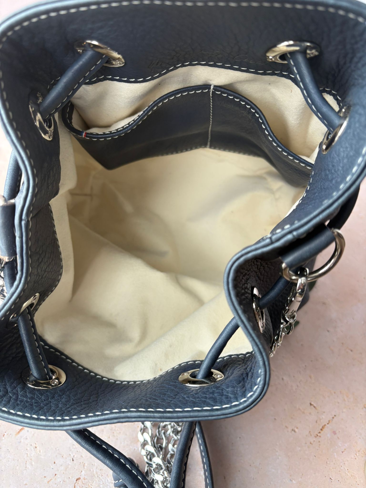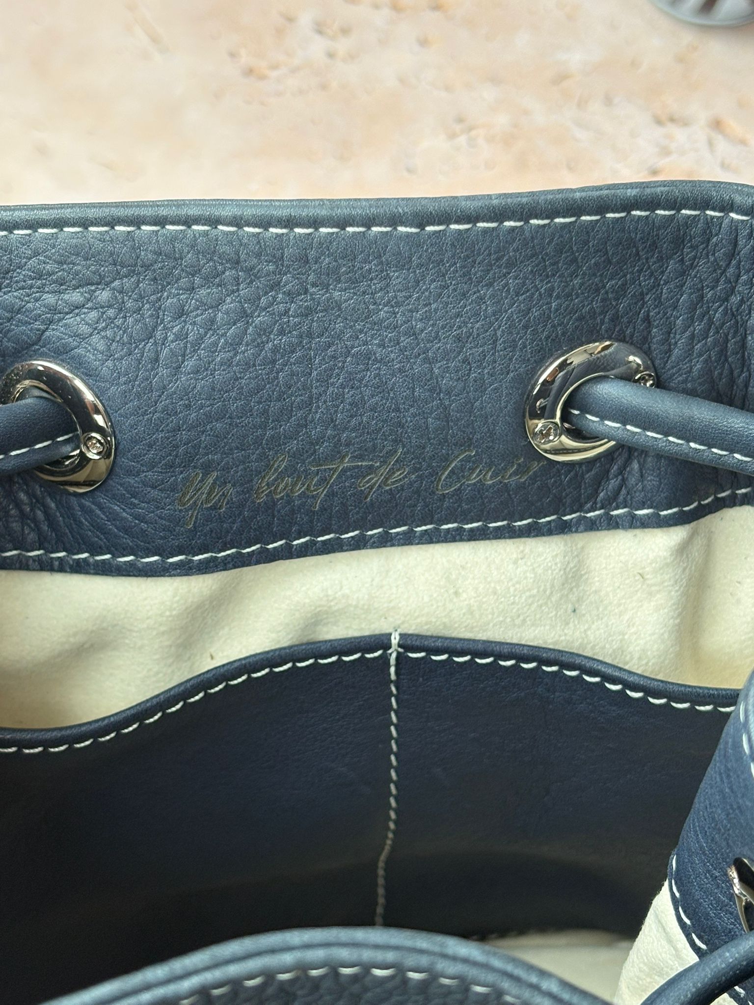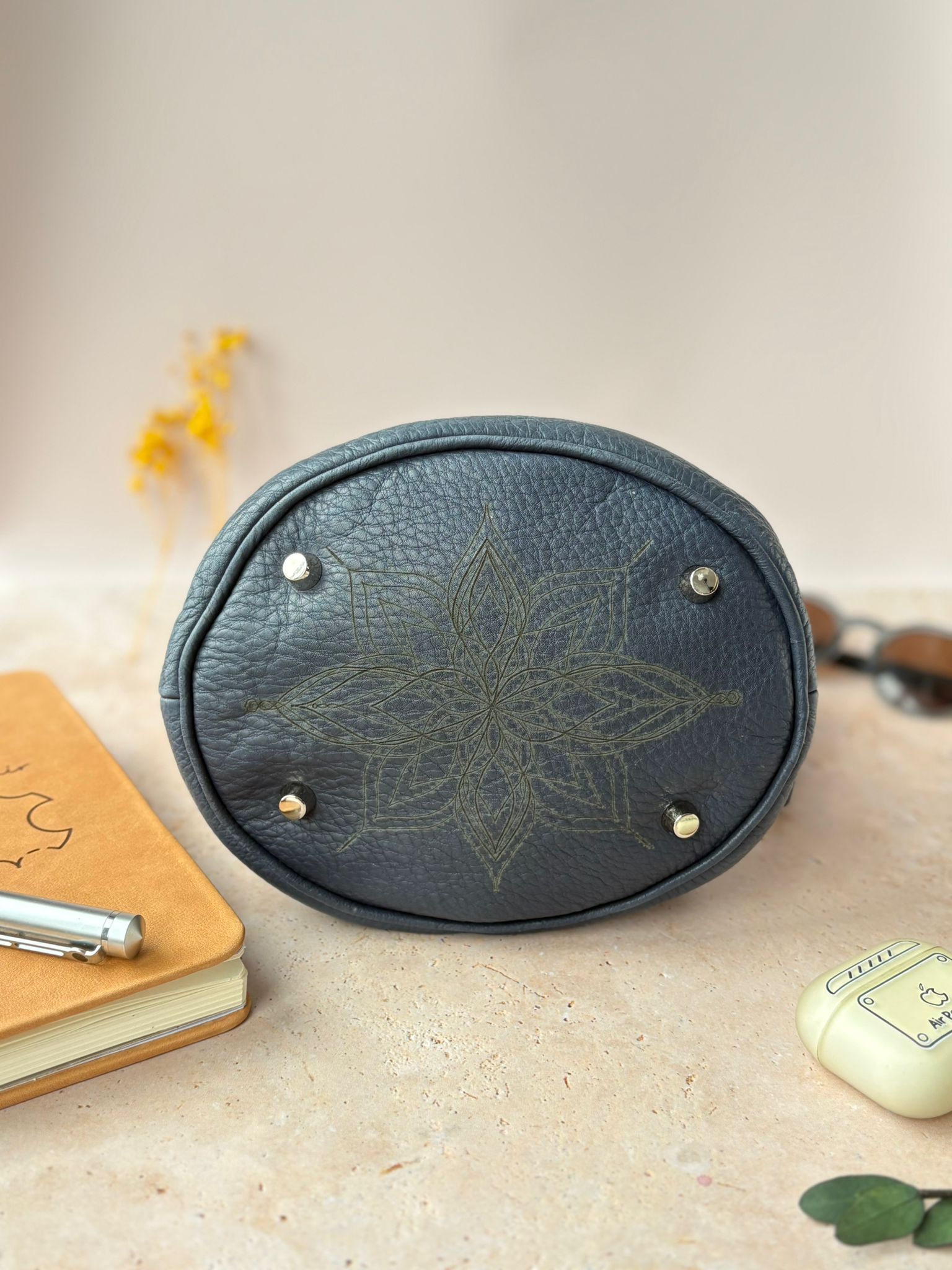 Adoptez ce sac en cuir de vachette grainé bleu foncé ! Sa doublure en alcantara beige offre un beau contraste avec le cuir extérieur. Le fond du sac est gravé d’un délicat mandala, un joli détail qui reste discret.