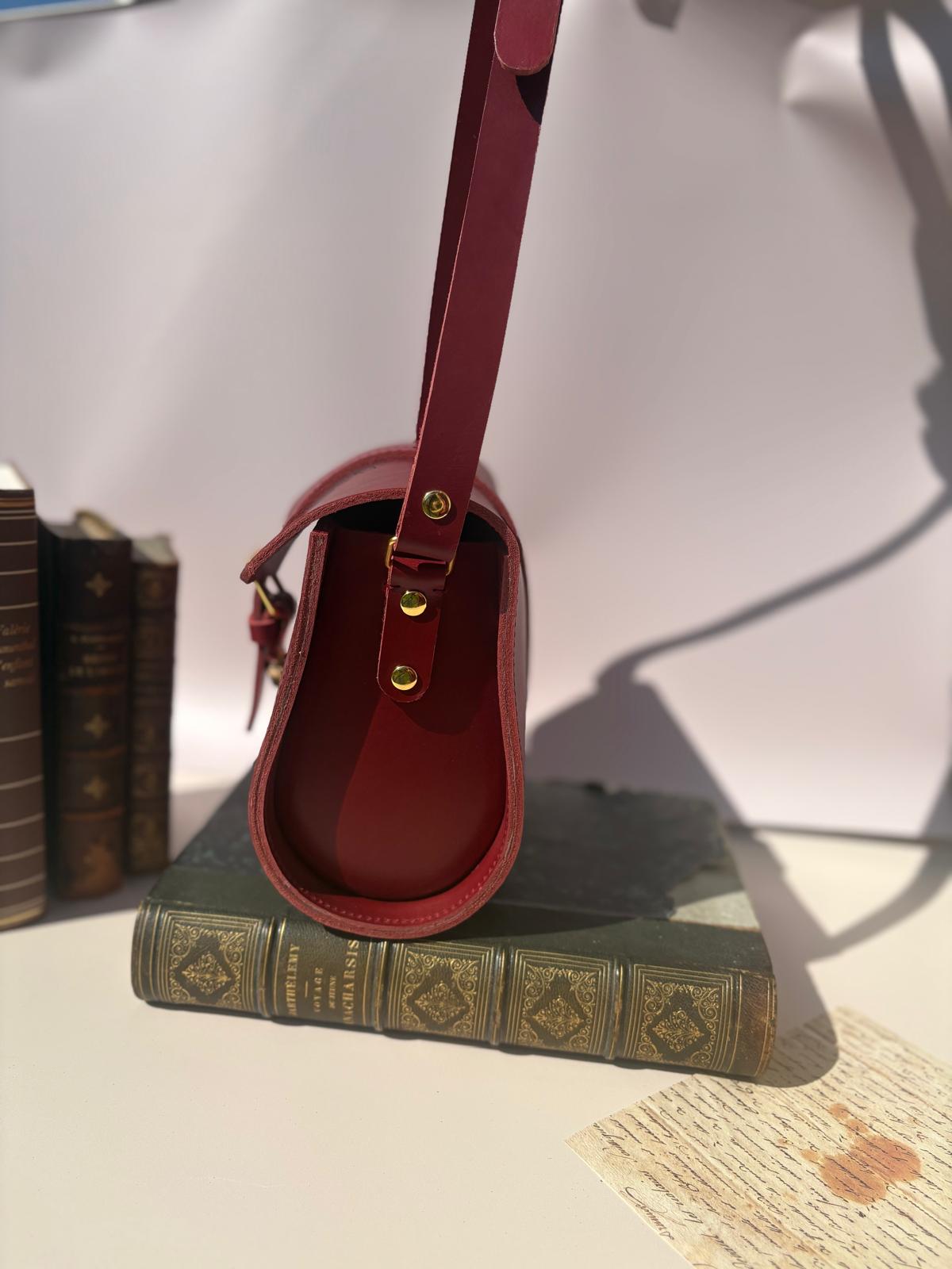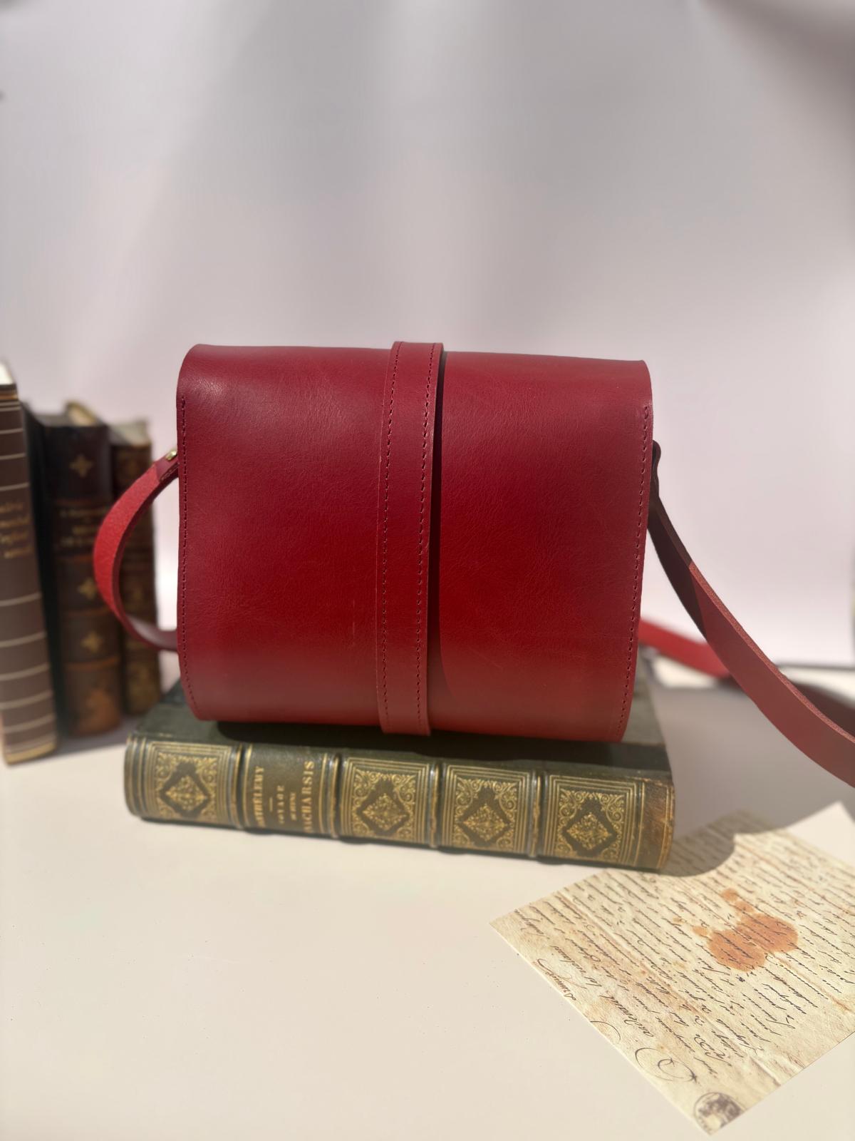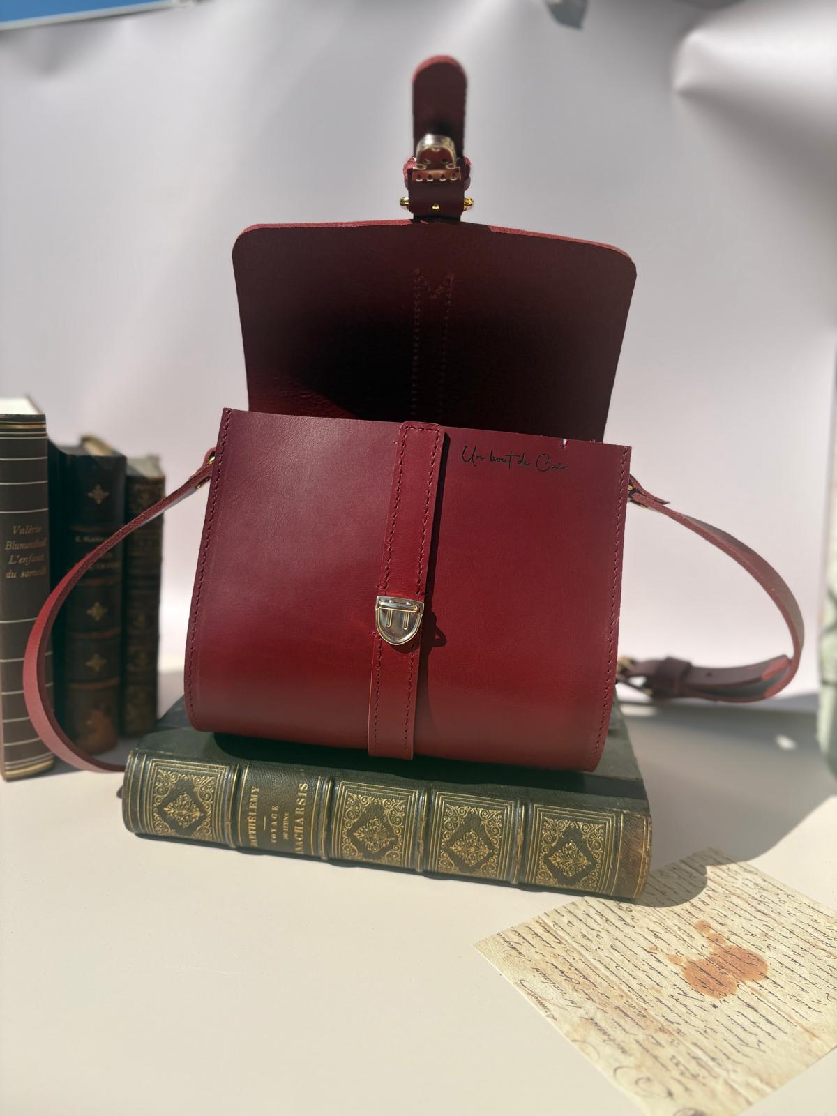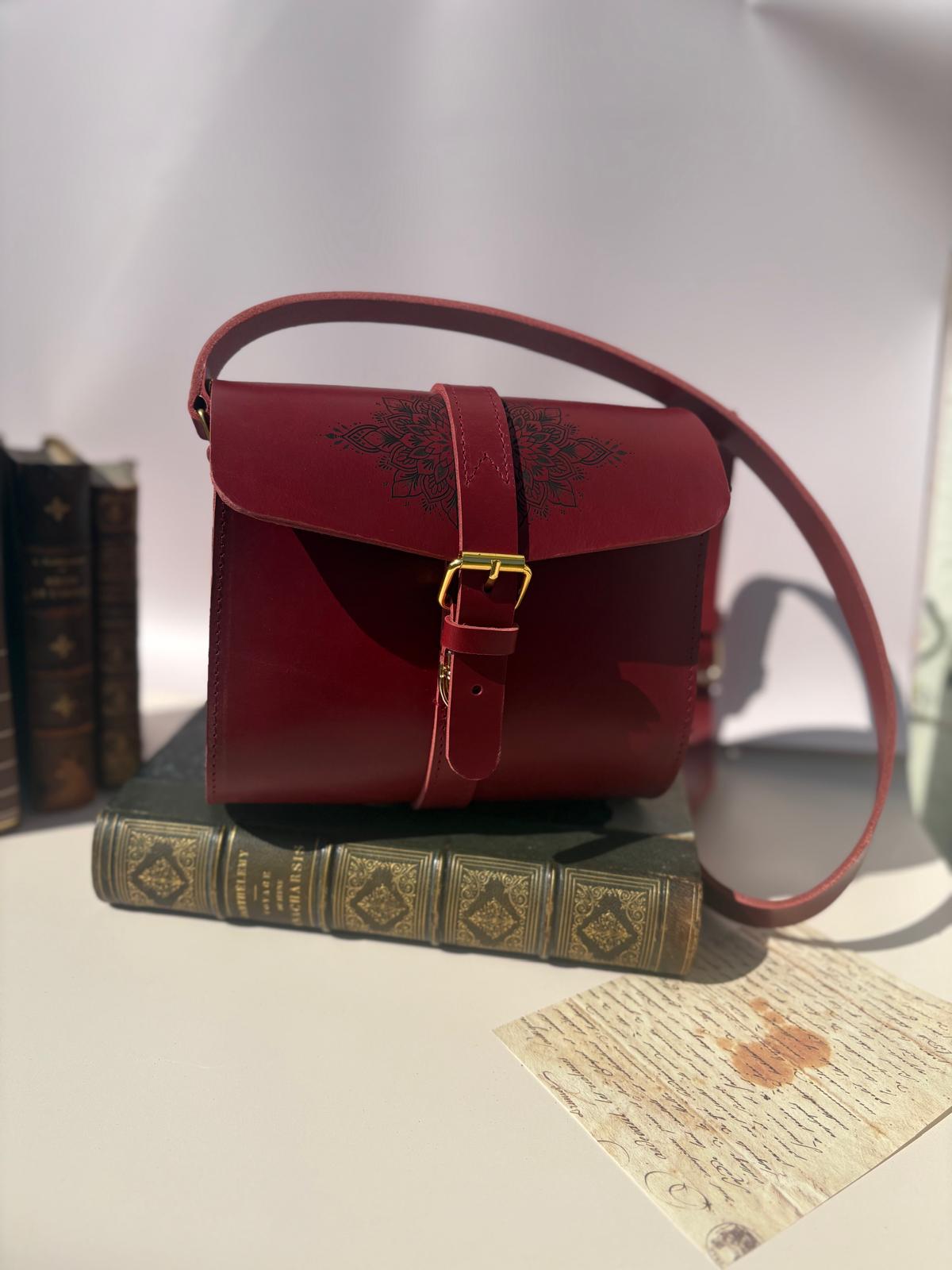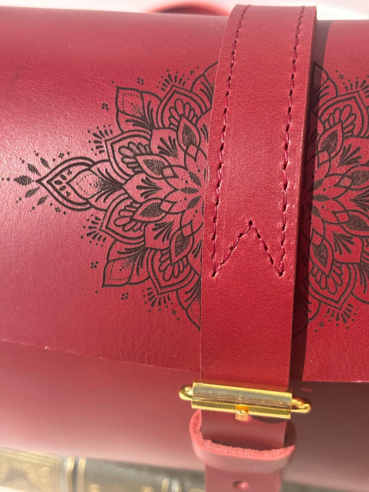 Ce sac à été réalisé dans un cuir de vachette pleine fleur rouge, avec un mandala gravé sur le rabat.