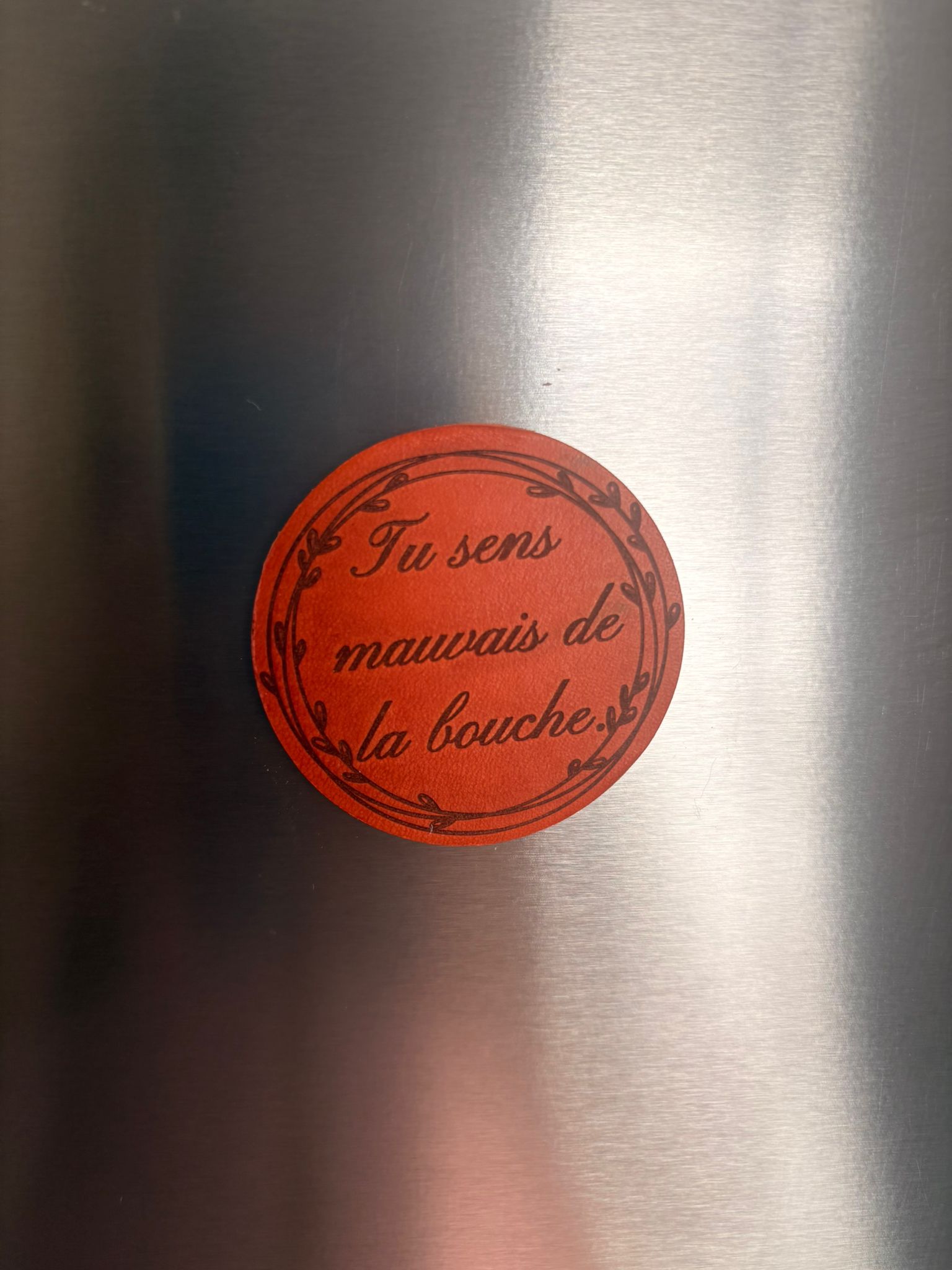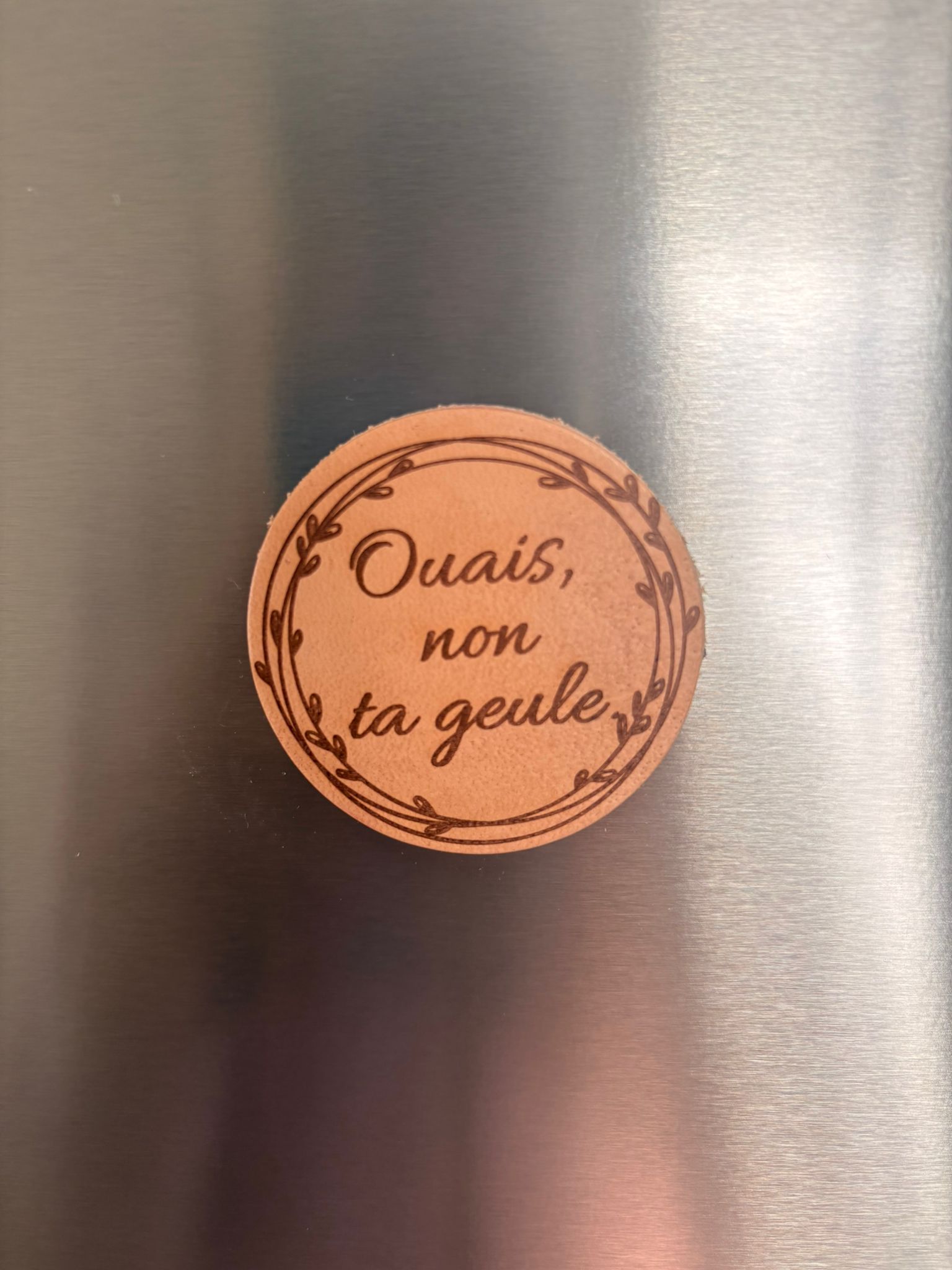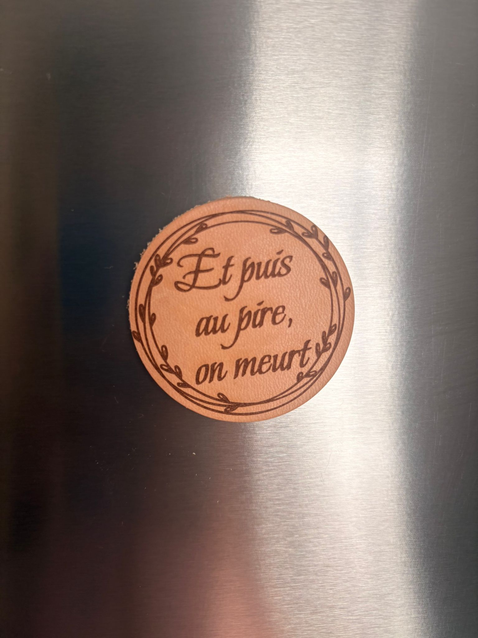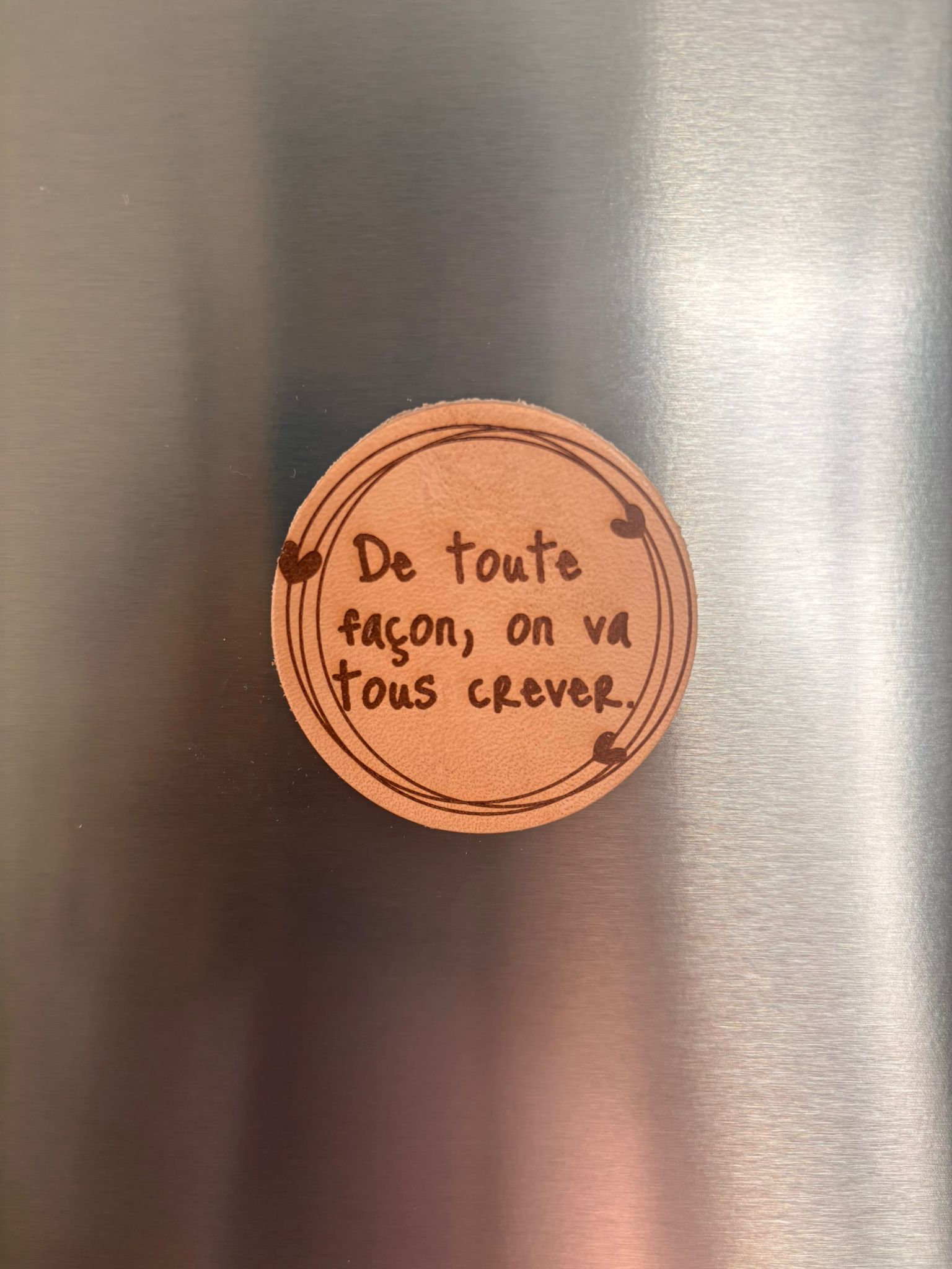 De jolie magnet en cuir végétal avec de mignon petits messages gravé dessus.
