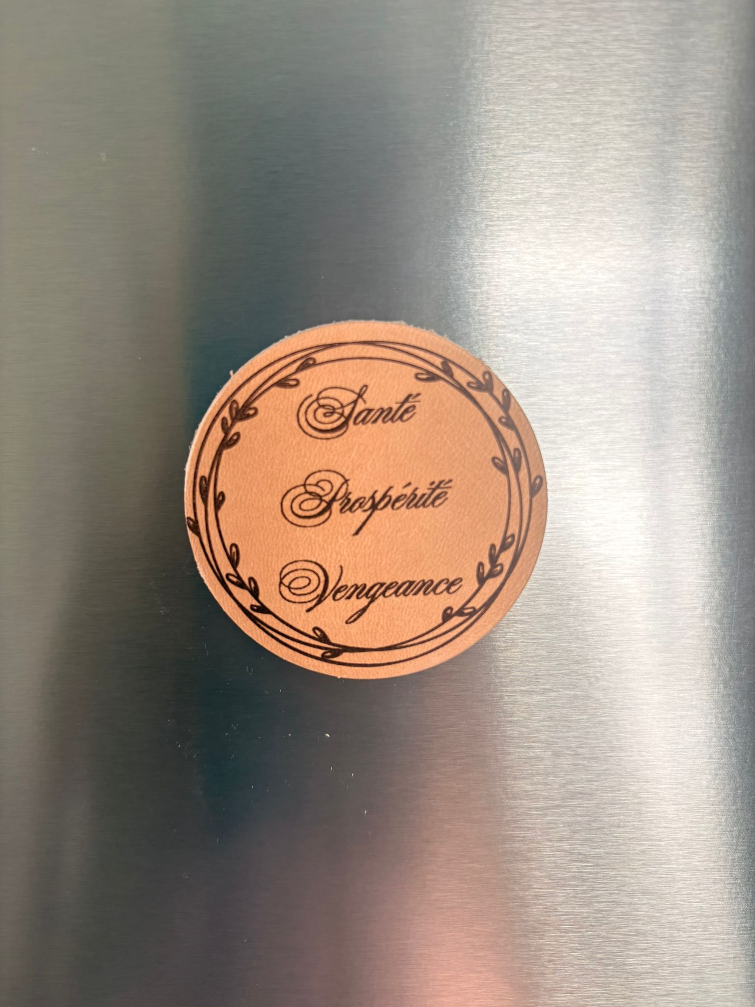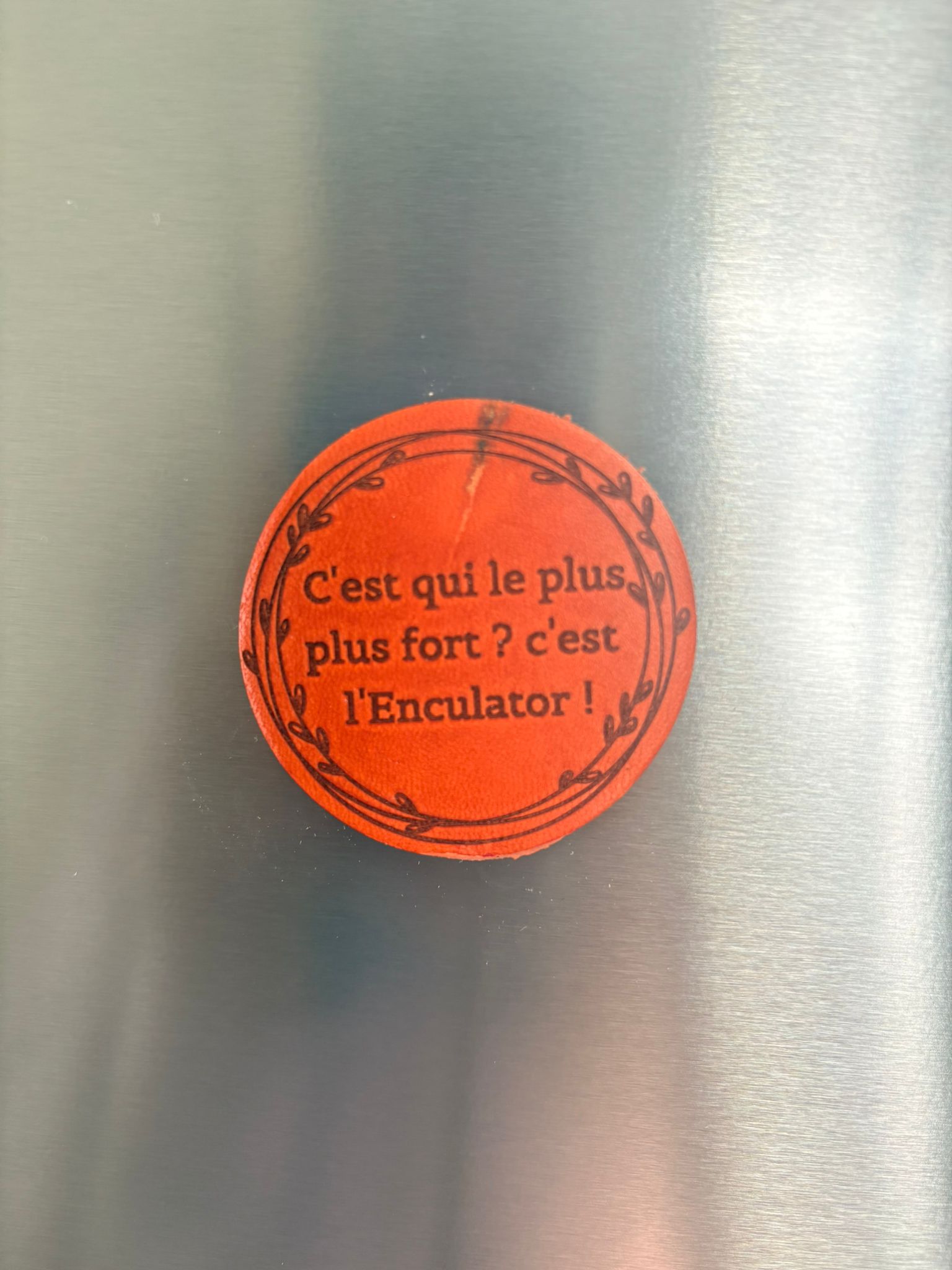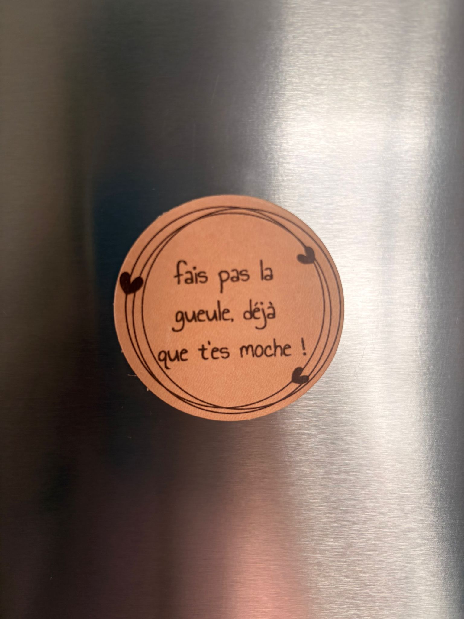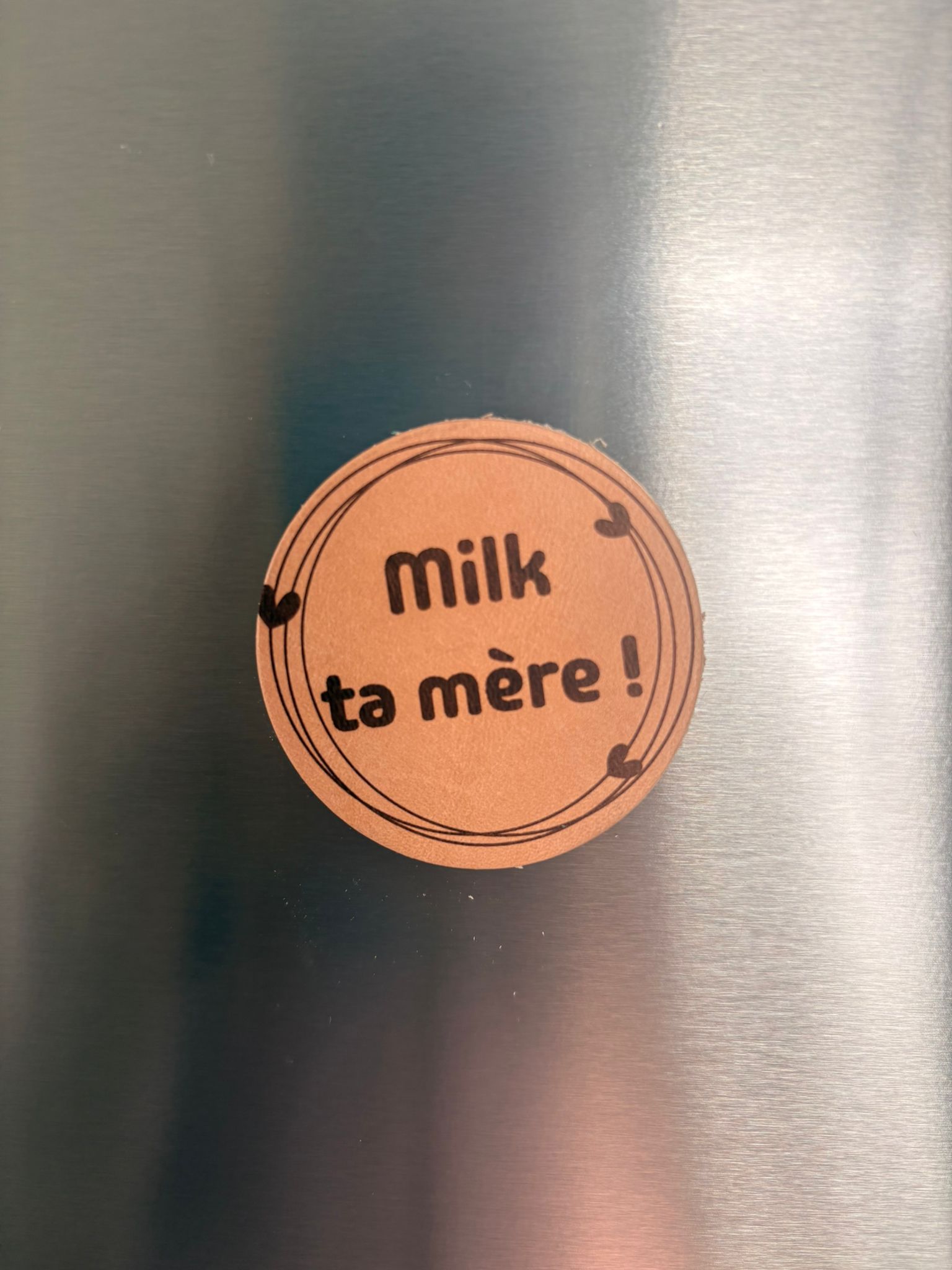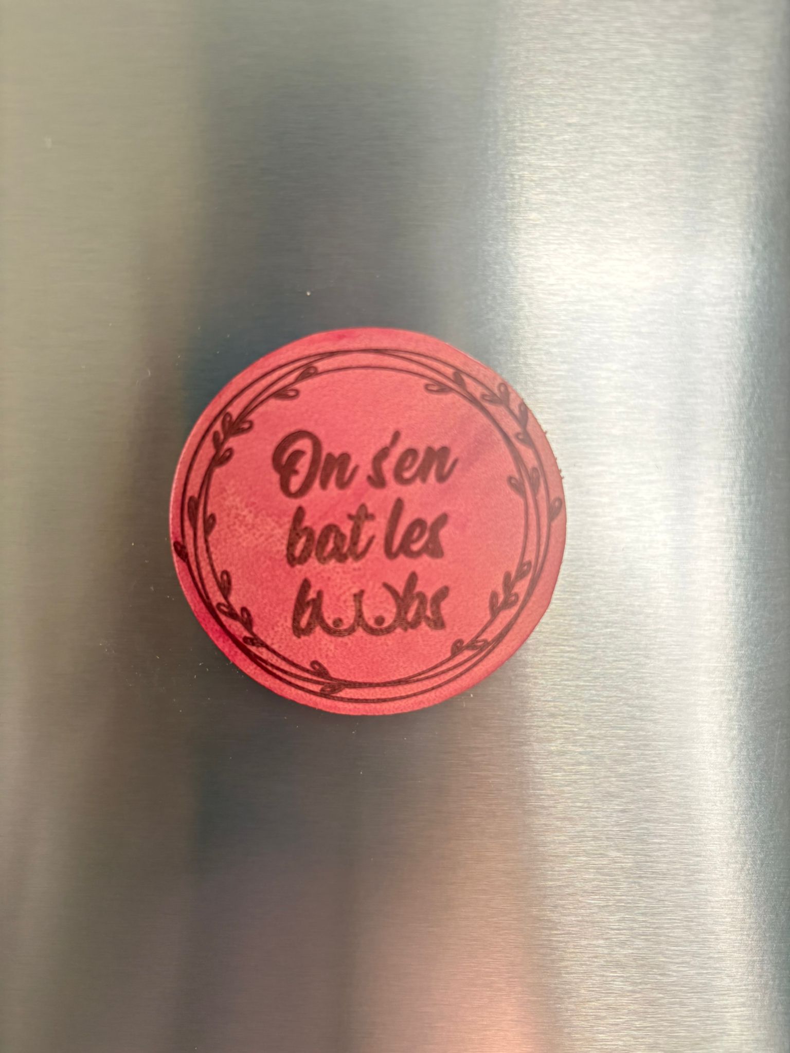 De jolie magnet en cuir végétal avec de mignon petits messages gravé dessus.