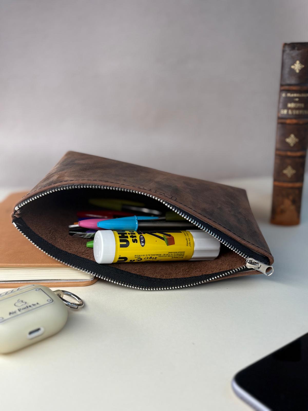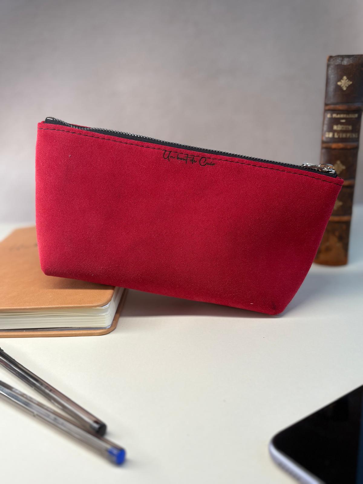 Confectionnée à la main dans un cuir de haute qualité, elle offre désormais un volume généreux pour organiser sereinement vos objets volumineux : chargeurs, maquillages, sets complets de dessin ou accessoires tech.